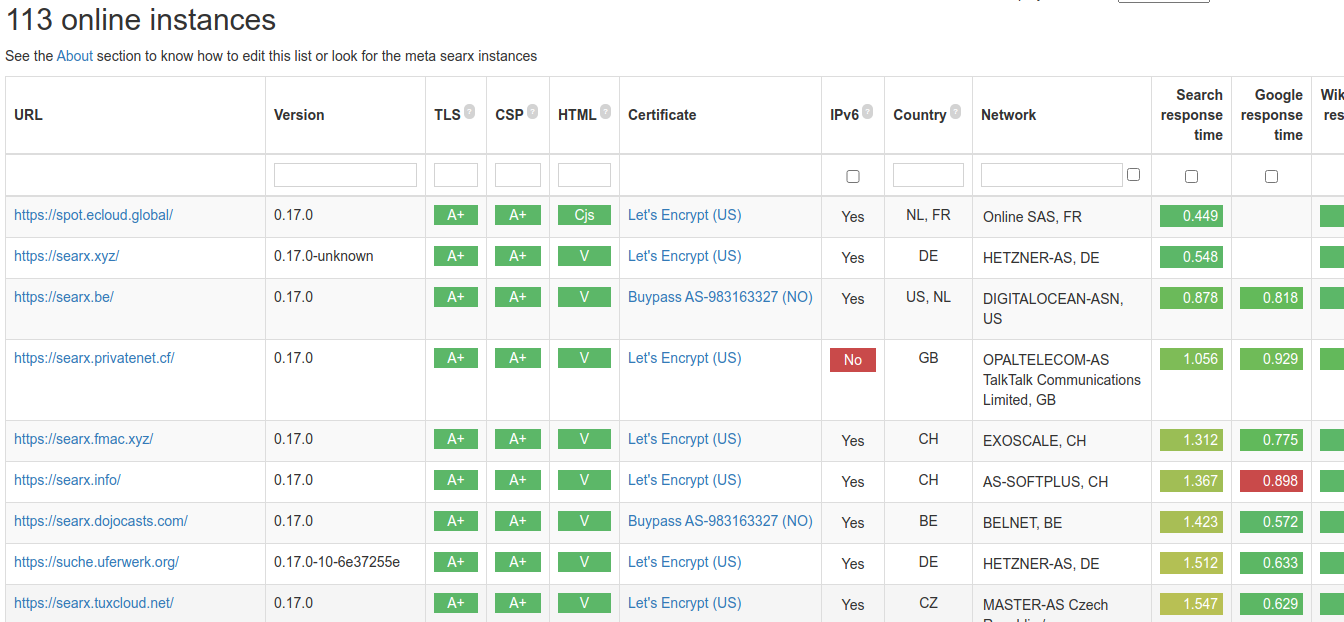 None of that’s very important. The point is that you’ll be proxied out not just to Google, but to a bunch of engines–Searx is a metasearch, typically drawing from Bing and DDG and other places all at once. The proxy servers are run by individual admins and interested groups, and you can roll your own too, if you can afford the bandwidth to do so on the behalf of others. Plus: