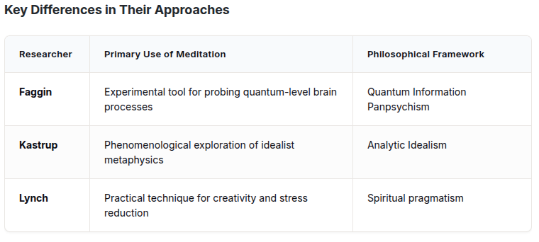 Unlike Faggin and Kastrup, Lynch positions TM more as a socially beneficial practice rather than a research method.